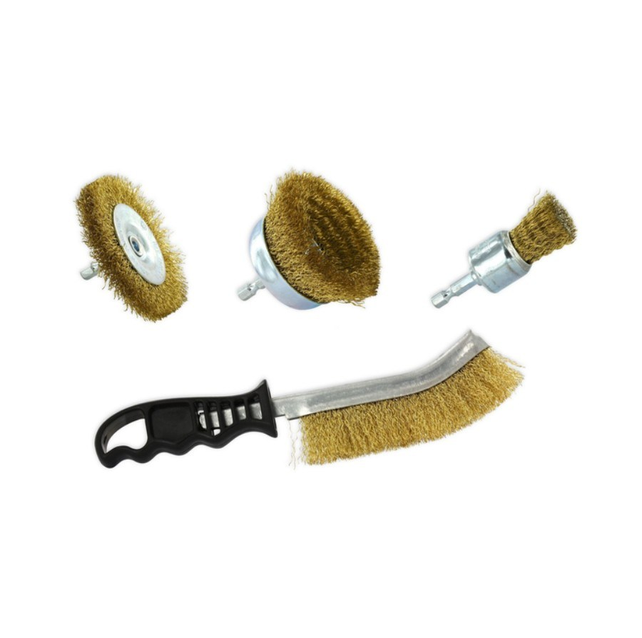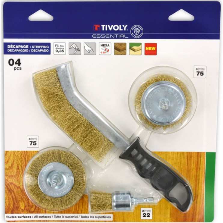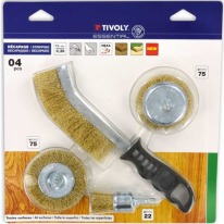 3 šepetėliai grąžtui + 1 ergonominis rankinis šepetys senų dažų šalinimui nuo medienos.