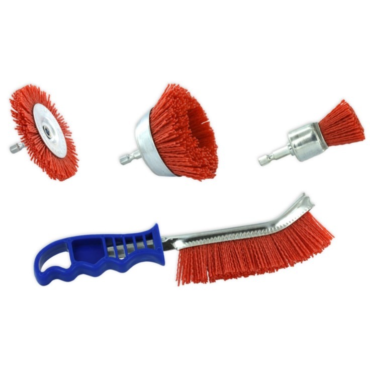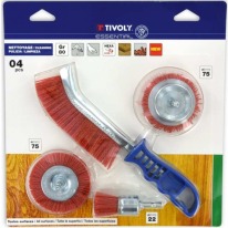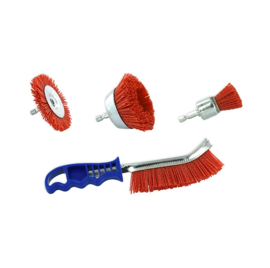 3 šepetėliai grąžtui + 1 ergonominis rankinis šepetys medienos, vario ir metalo valymui.