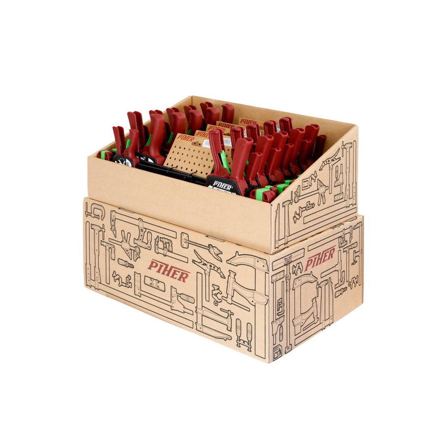 The Piher PI52630 30cm and PI52415 15cm one-hand quick clamps set offers a convenient selection of five versatile clamps displayed in a tabletop cardboard stand. Designed for efficient clamping and spreading, each clamp allows true one-handed operation, making them highly effective for tasks that require precision and speed. Strong nylon fiberglass jaws and a hardened carbon steel bar combine to deliver reliable clamping force while protecting delicate work surfaces. The set is suitable for repetitive assembly jobs, woodworking, and general repairs, providing reliable hold and easy adjustment in tight or solo work situations.