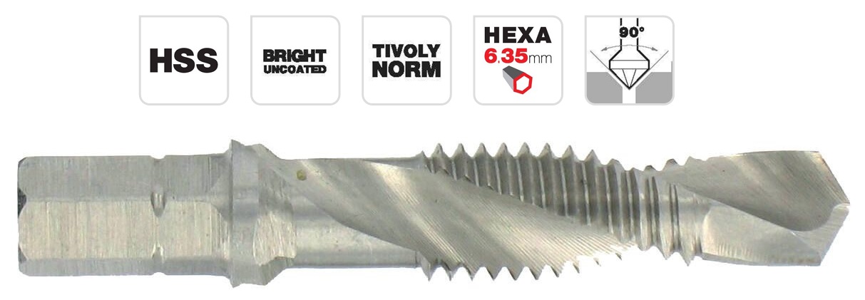 3-in-1 tool: drill, thread tap and deburring device in one.